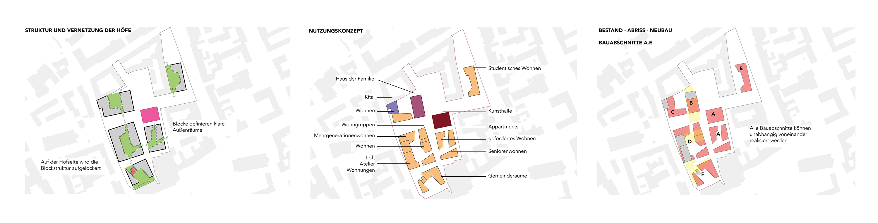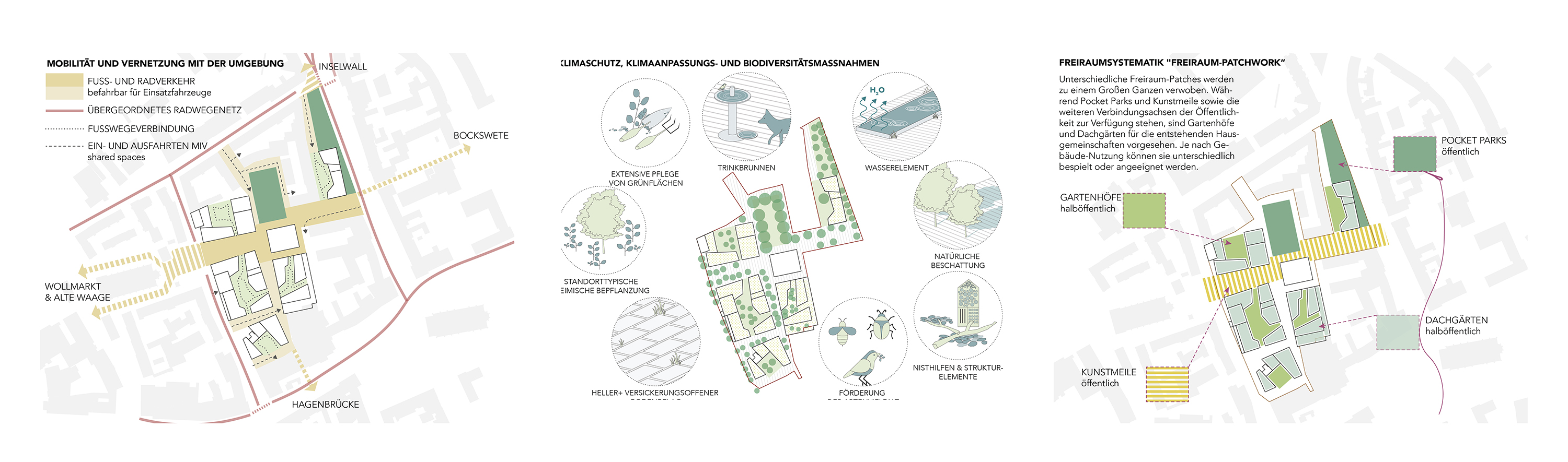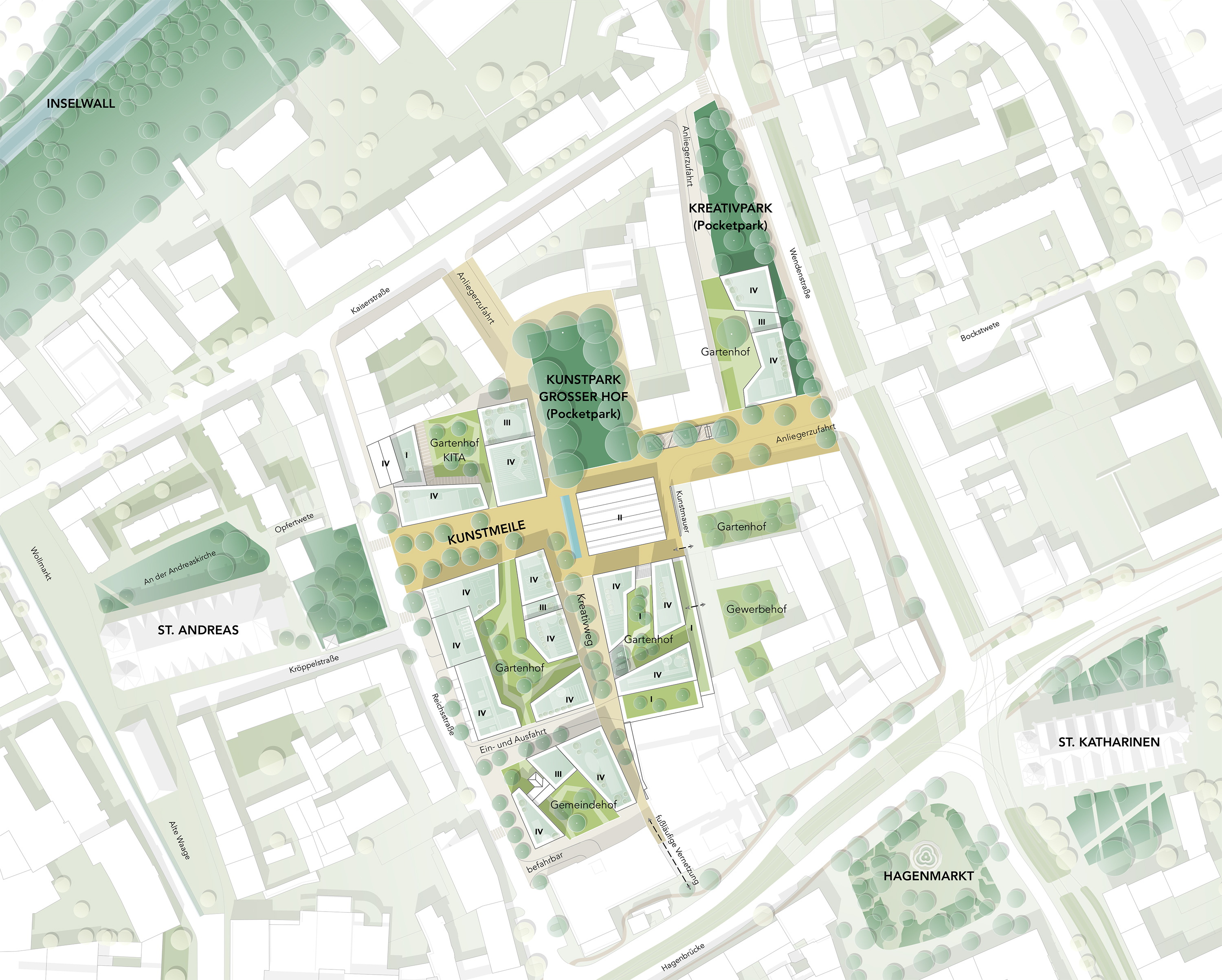 The center of the creative quarter planned within the framework of this competition will be formed by a new public urban space, stretching from Werder through the Andreaskirche to the Wollmarkt. At the heart of this area, the so-called "Art Mile," lies the Große Hof – a central green park designed both as a place for relaxation and as a venue for artistic activities, functioning as a "Creative Park." The park is flanked by a gallery, which serves as the "hub" of the quarter.