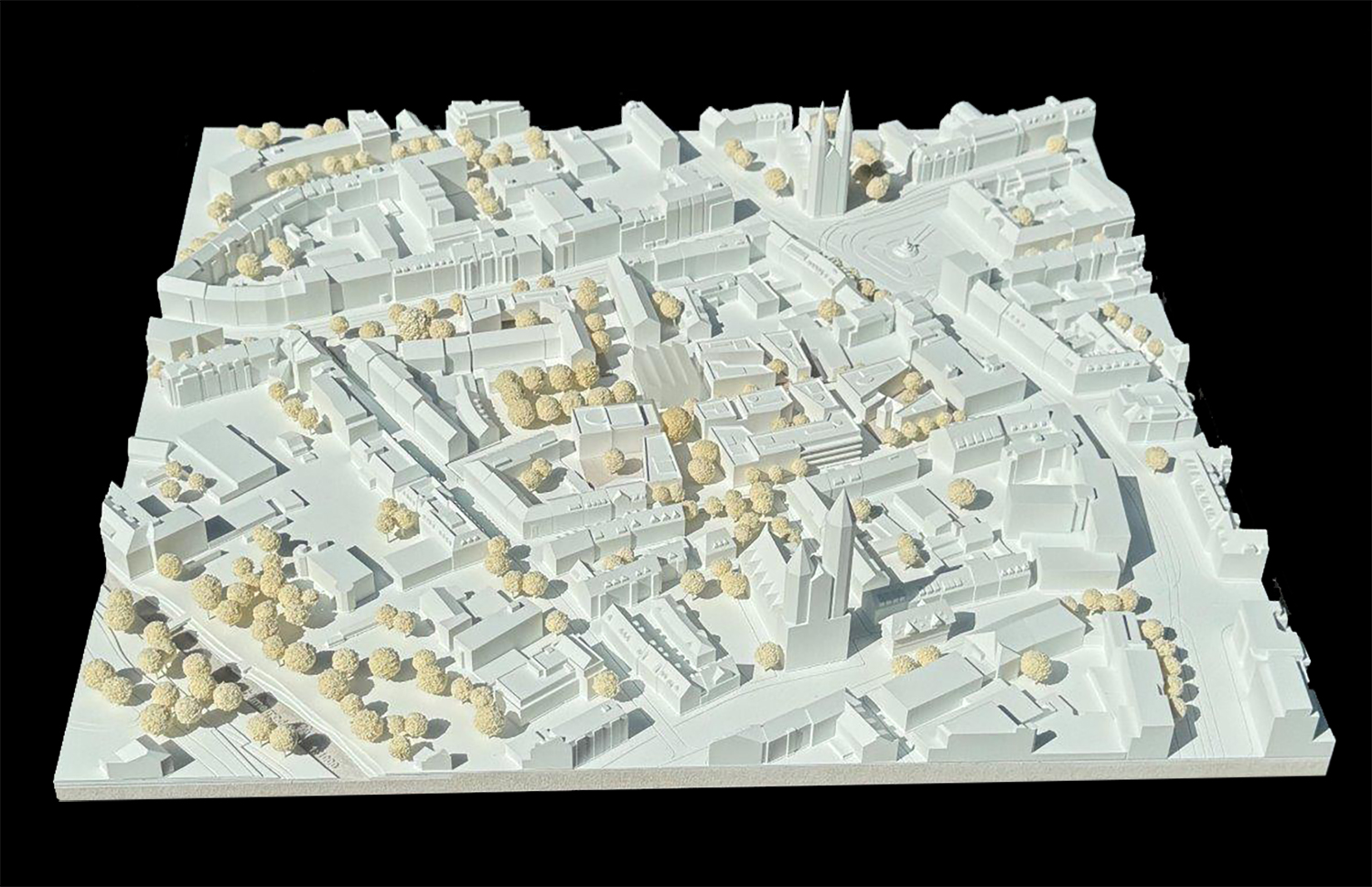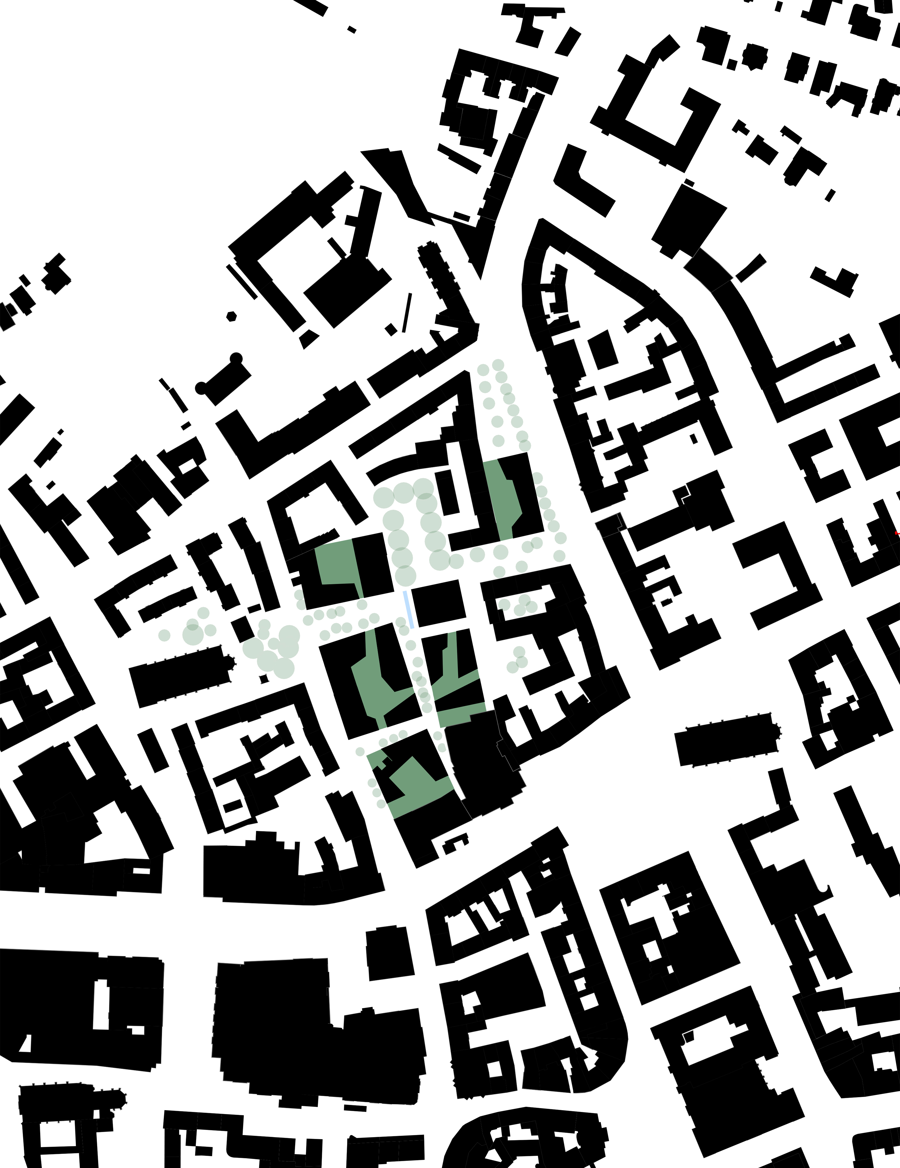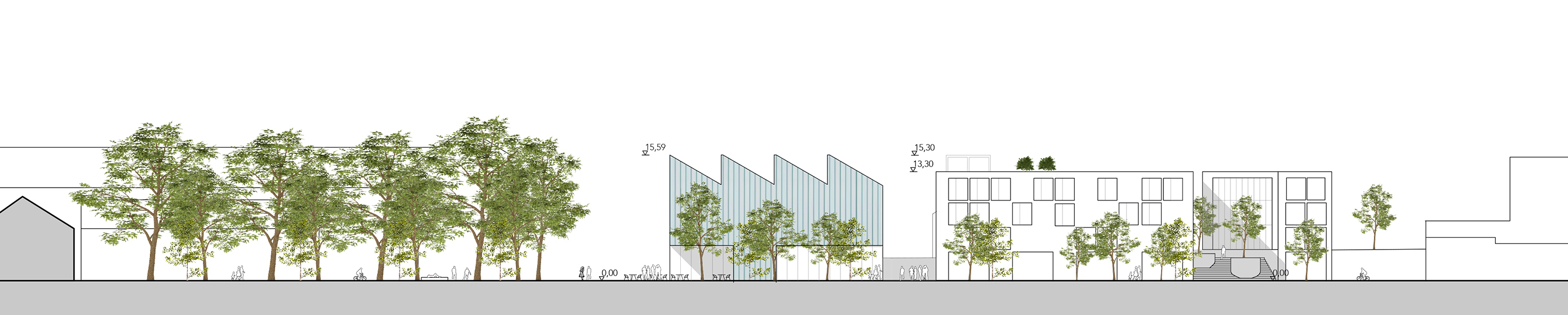 The center of the creative quarter planned within the framework of this competition will be formed by a new public urban space, stretching from Werder through the Andreaskirche to the Wollmarkt. At the heart of this area, the so-called "Art Mile," lies the Große Hof – a central green park designed both as a place for relaxation and as a venue for artistic activities, functioning as a "Creative Park." The park is flanked by a gallery, which serves as the "hub" of the quarter.