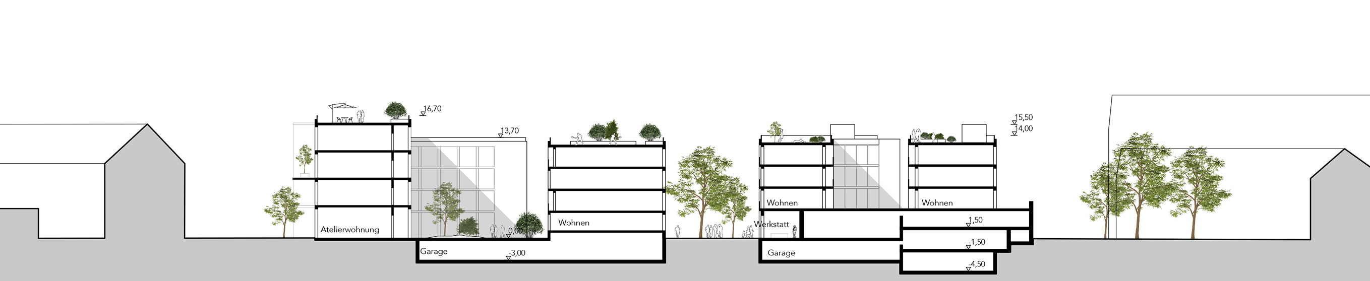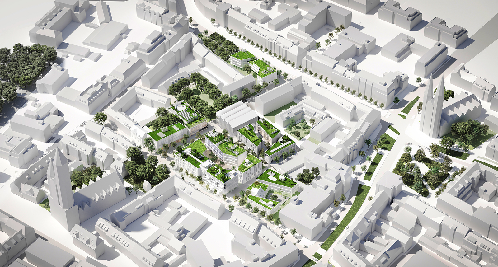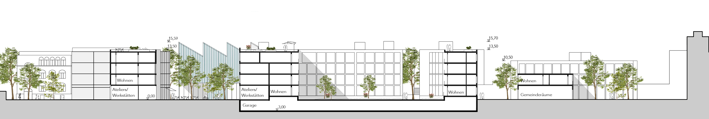 The primary urban design element of the new creative quarter is the building block. The building blocks that structure the quarter are not "leftover spaces" between surrounding streets in this concept but rather independent, geometrically recognizable urban elements, between which differentiated outdoor spaces emerge. The character of these urban elements is defined by clear, façade-forming exterior walls, while the inner areas are open and transparent. Balconies, loggias, and green façades are incorporated, integrating the central greenery of each building block into the living spaces.