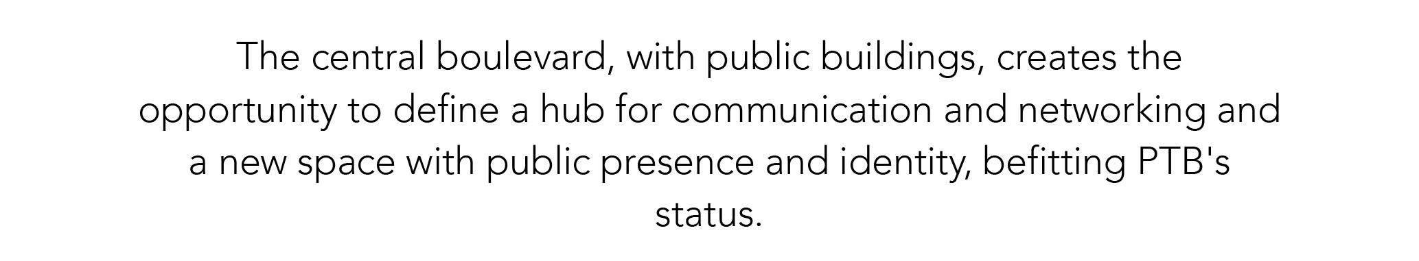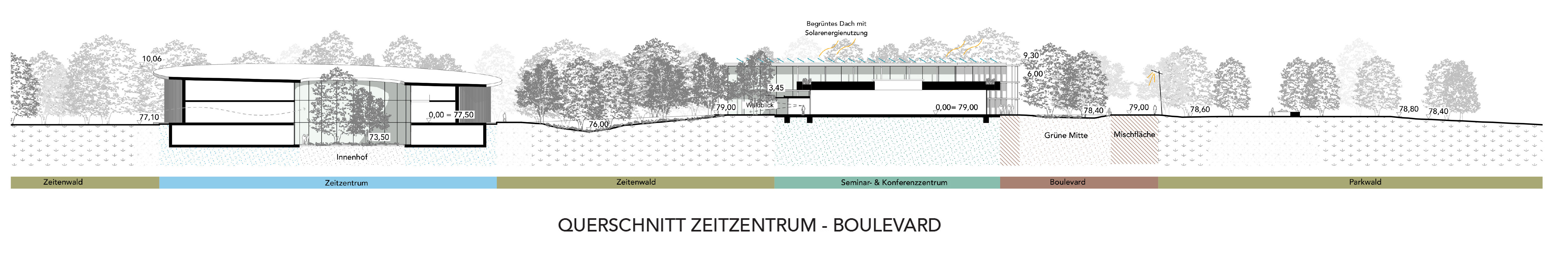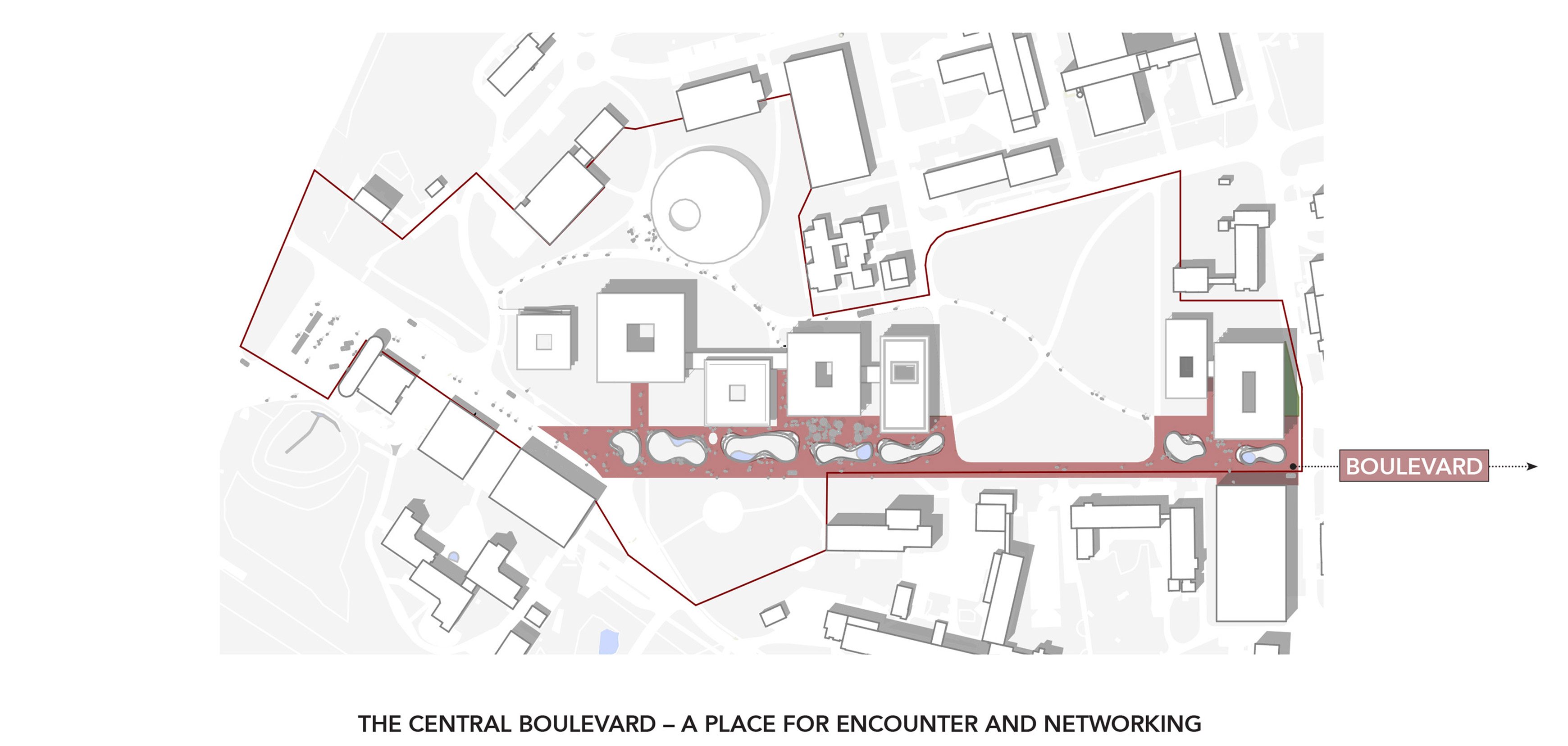 At the core of the design is the newly developed boulevard, which serves as the campus's central axis. This boulevard connects seven carefully positioned buildings and opens up into a generous "clearing in the forest." The boulevard provides clear orientation and emphasizes the inclusive and welcoming character of the campus through its open design. Public buildings such as the library, conference center, and cafeteria, designed as transparent pavilions, blend seamlessly into the natural surroundings while offering high aesthetic and functional quality for visitors.