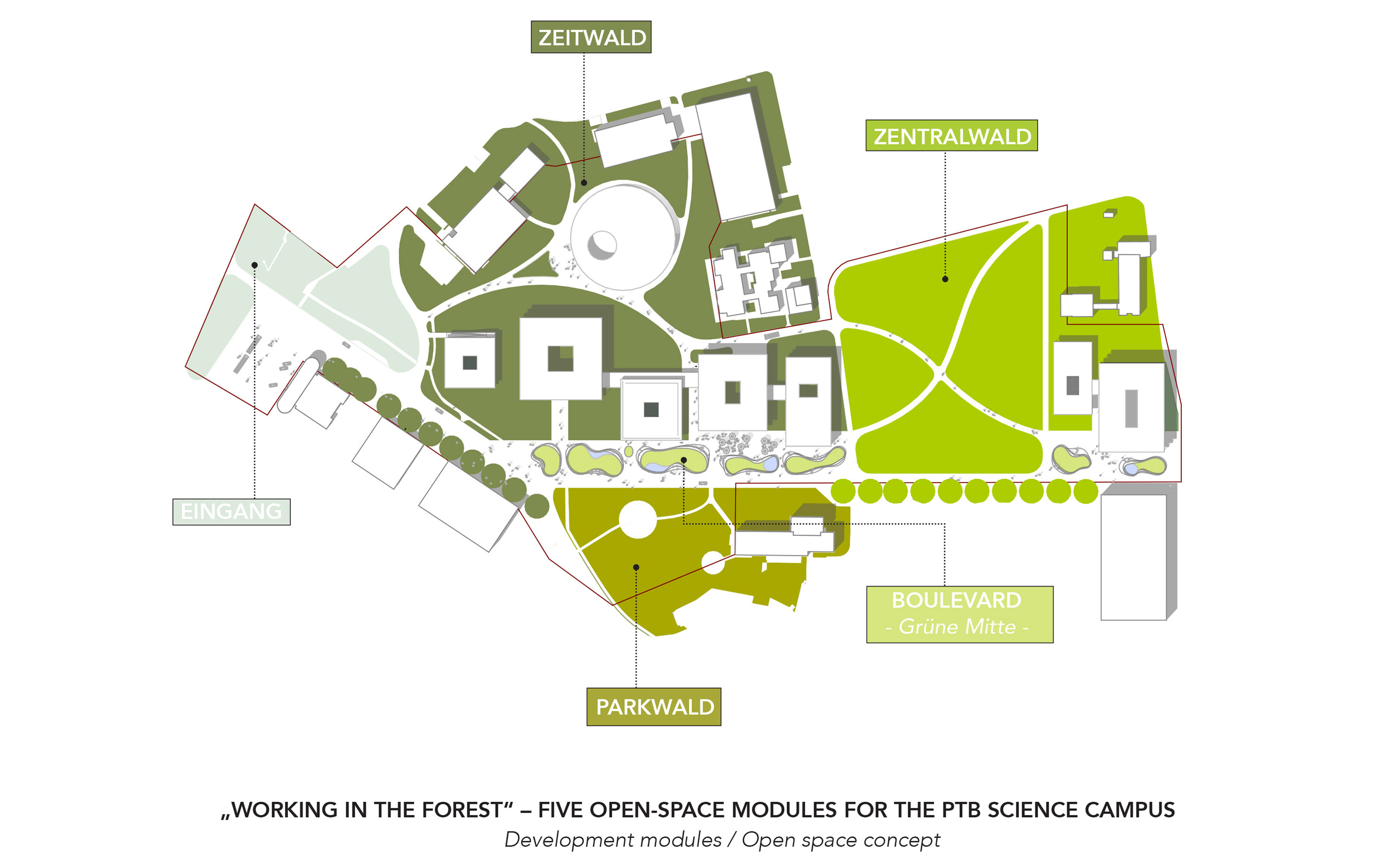 Another key focus is the design of open spaces, characterized by four thematic forest modules. These modules create specific spaces for activities and recreation, reinforcing the guiding principle of "Working in Green Environments" and positioning the campus as an inspiring location for knowledge work.