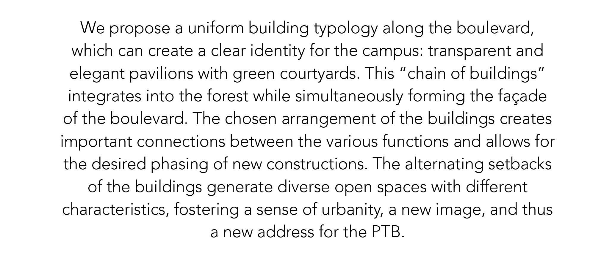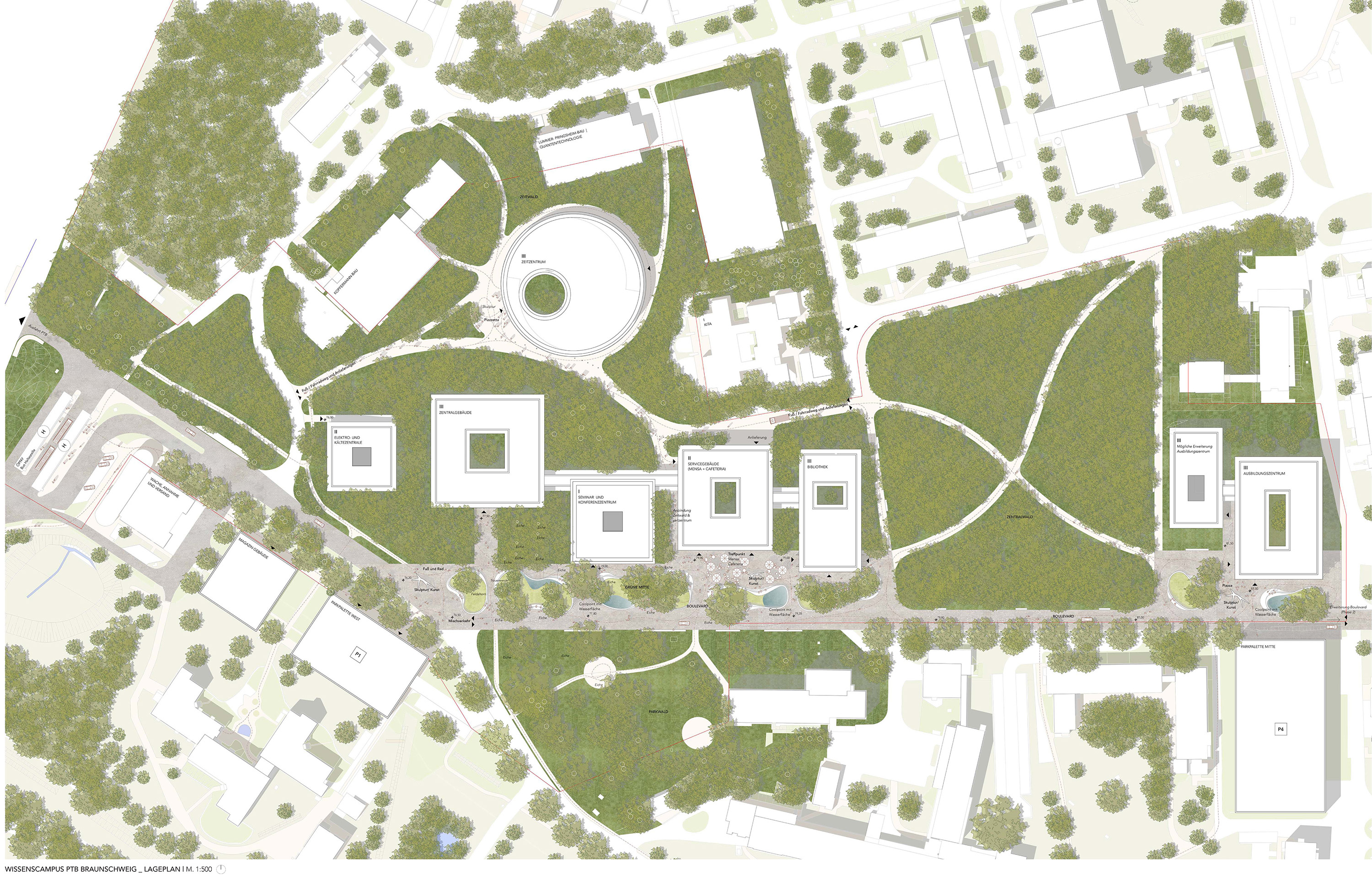 The Science Campus of the Physikalisch-Technische Bundesanstalt in Braunschweig combines international top-level research and scientific excellence with a unique work environment surrounded by natural landscapes. The design embraces the guiding principle of "Working in the Park" and develops it further by integrating the expansive forested areas into a forward-looking urban design concept. This concept not only creates spaces for scientific innovation but also ensures an exceptional quality of stay and work. A central focus was placed on establishing a hub at the heart of the campus to foster networking and exchange between science, society, and the economy.